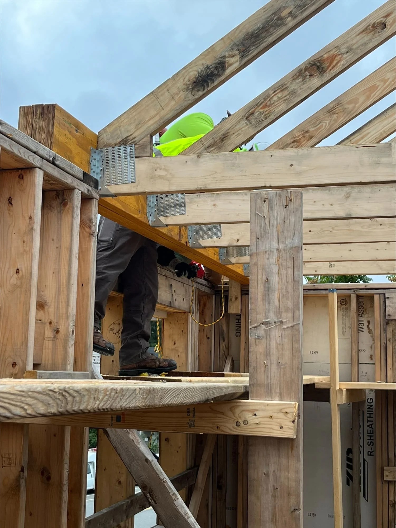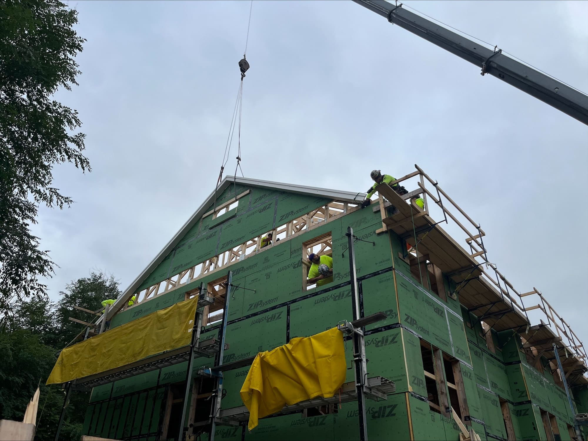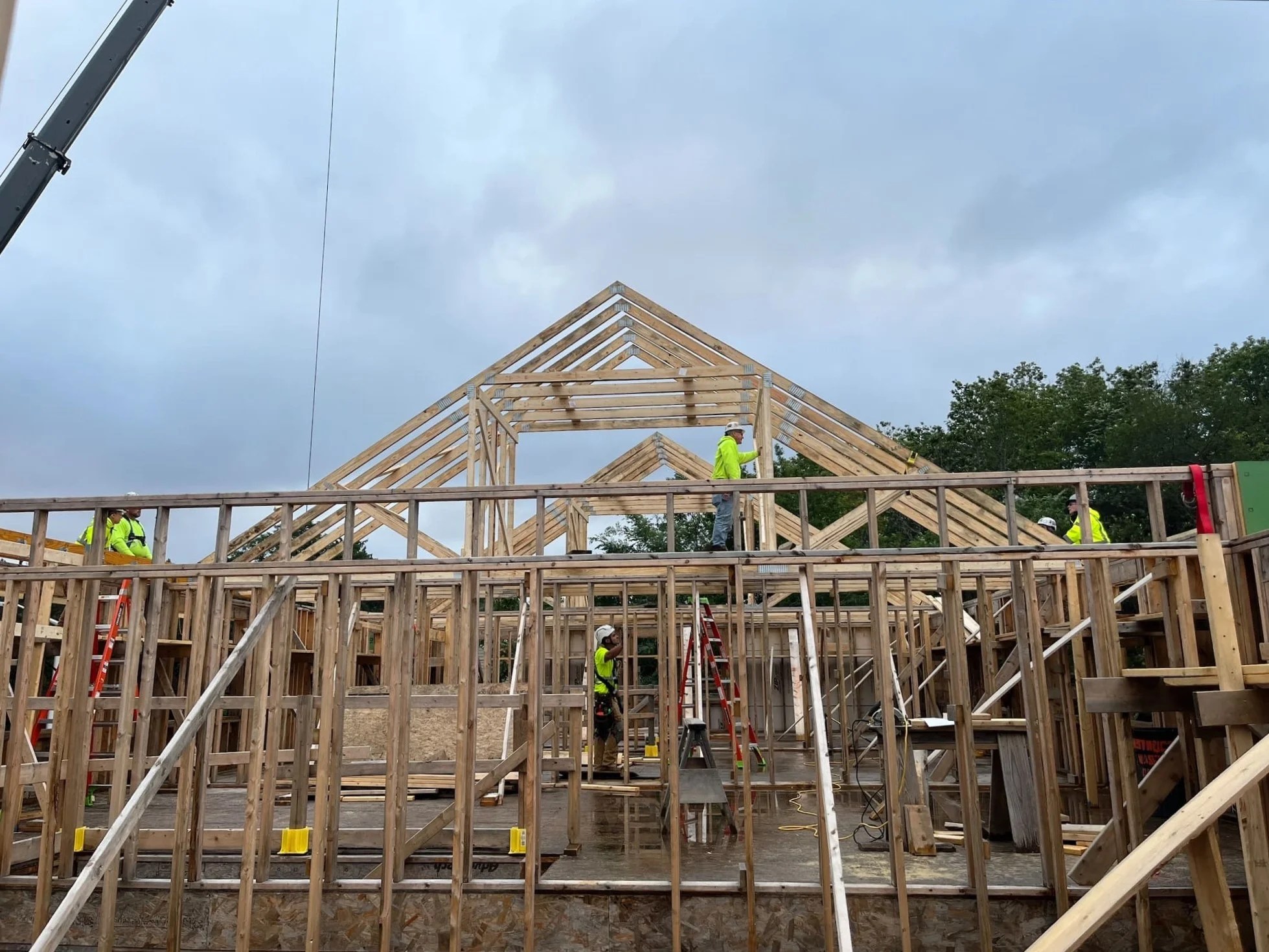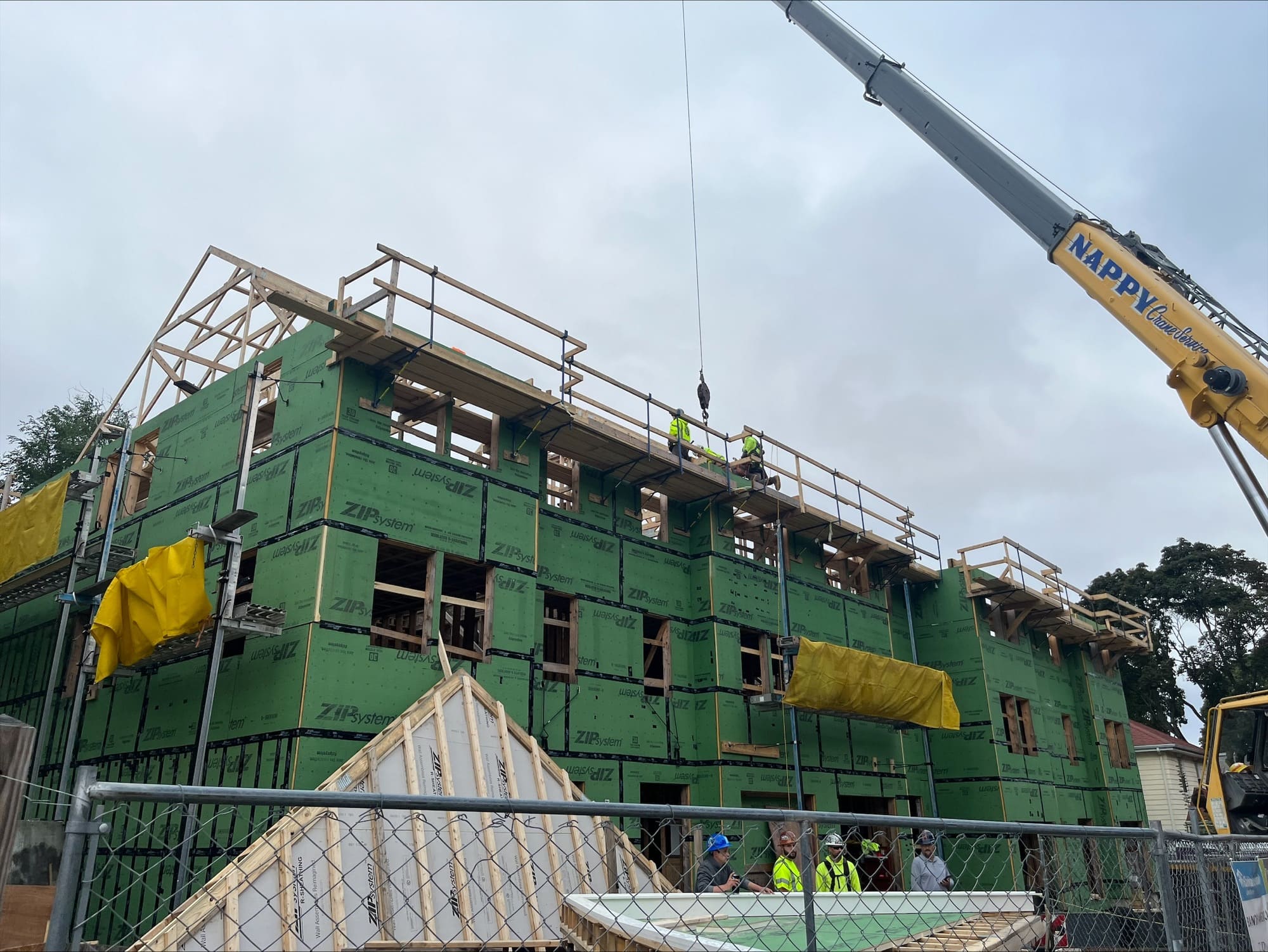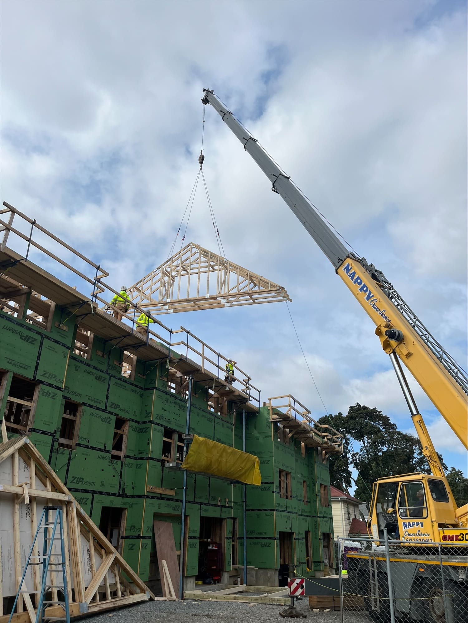 Over two weeks in September and October, Nappy Crane Service in Everett provided a crane and operator to lift preassembled roof trusses into place atop the five-townhome building where they were installed by apprentices from the North Atlantic States Carpenters Training Fund.